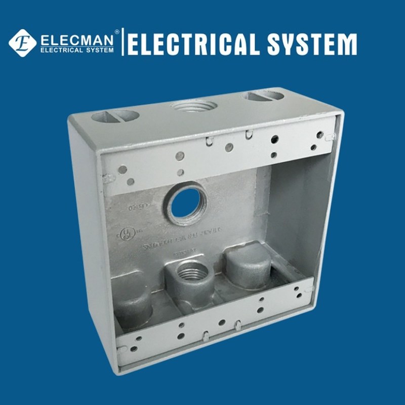 ELECMAN®アルミニウム2 -一団は強さおよび弾性のための優れた粉のコートの終わりを用いる死ぬために3つの出口の穴の特徴の優秀な商業用等級投げられた金属の構造が付いている電気箱に耐候性を施す。単一の、二重および三重の一団箱の私達のラインは複数のアプリケ−ションを収容するように設計されている。3つの出口の穴は、二重一団箱30.5立方インチ容量を特色にし、閉鎖のプラグ、土台ラグナットと完全そして速く、容易な取付けのための基づいているねじであり。