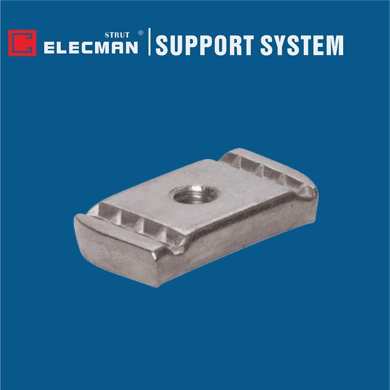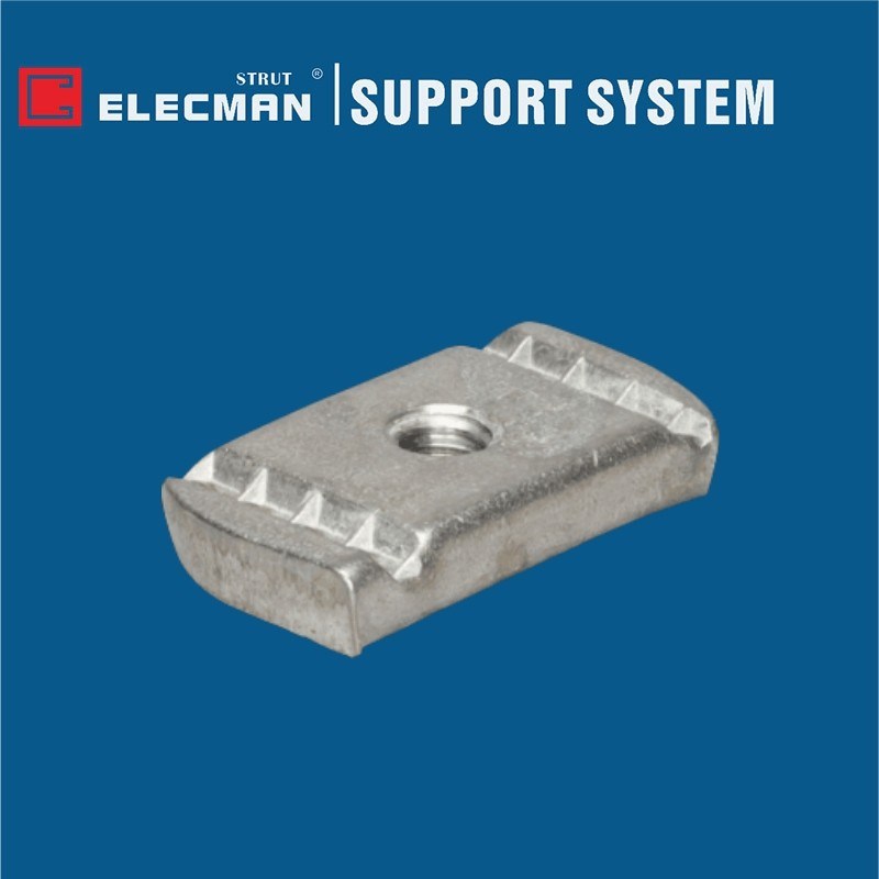 エレクマン®スプリングなしの亜鉛めっき鋼ストラット チャンネル クランプ ナットは、チャンネル サポート システムに不可欠です。それらは、チャネルの開いた側から挿入され、90 度回転して、歯付きの溝がチャネルのリターン フランジにフィットします。