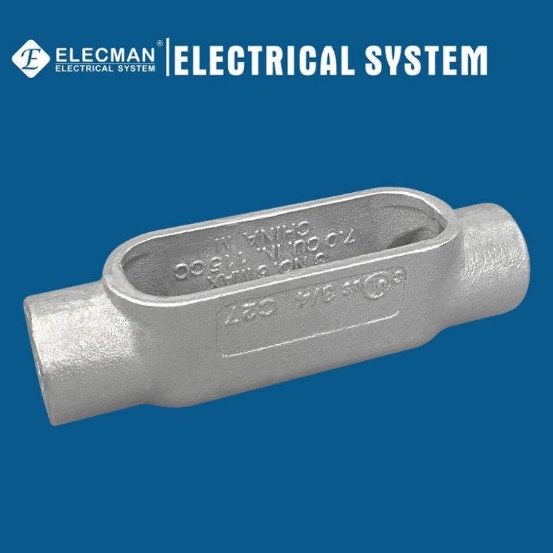 ELECMANの®は7ねずみ鋳鉄1/2を」形作る- 3つはIMC/Rigidの水路ボディCのタイプに通した、入口および出口はアクセス カバーの上そして底にある。これらのタイプの水路ボディはまっすぐな操業のコンダクターを引っ張る。C型ボディによって、コンダクターは入口と出口間の回転をしない。C型の水路は屋内および屋外の使用のために適切である。