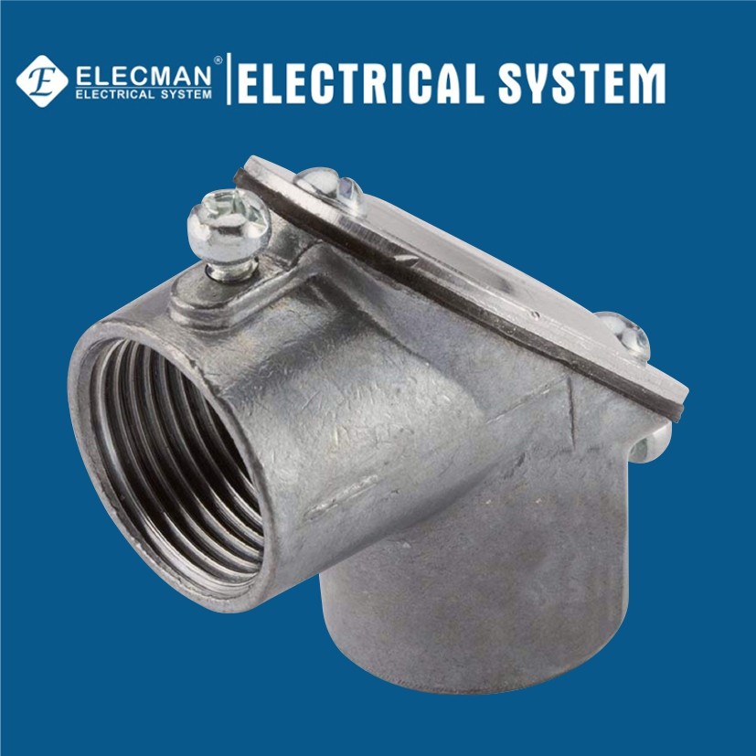 ELECMAN®は止めねじが鋼鉄EMTの2部分の90度のくねりを通してコンダクターを引っ張ることを促進するのにガスケットが付いているタイプに使用されている通した90度EMT/Rigidの引きの肘通された堅いまたはIMCを水路亜鉛でメッキする。取り外し可能なカバーは妨害なしで引っ張るワイヤーを達成するために十分なアクセスをへの提供する。これらのダイカストで形造られた亜鉛肘は乾燥した位置の適用のためである。