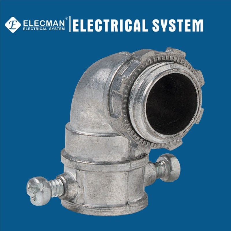 ELECMAN®は指定が近い半径を要求するとき90度の止めねじのコネクターを囲むためにEMTの水路を使用されている鋼鉄出口の箱かエンクロージャにEMTの水路を結合するのに亜鉛でメッキする。止めねじアセンブリは録音されたとき具体的で堅い関係を提供する。防蝕亜鉛鋳造物はから制作されて死ぬ;貿易サイズで利用できる1/2」、3/4"および1"。屋内使用のため;ULは速い配達のリストし、用意する。