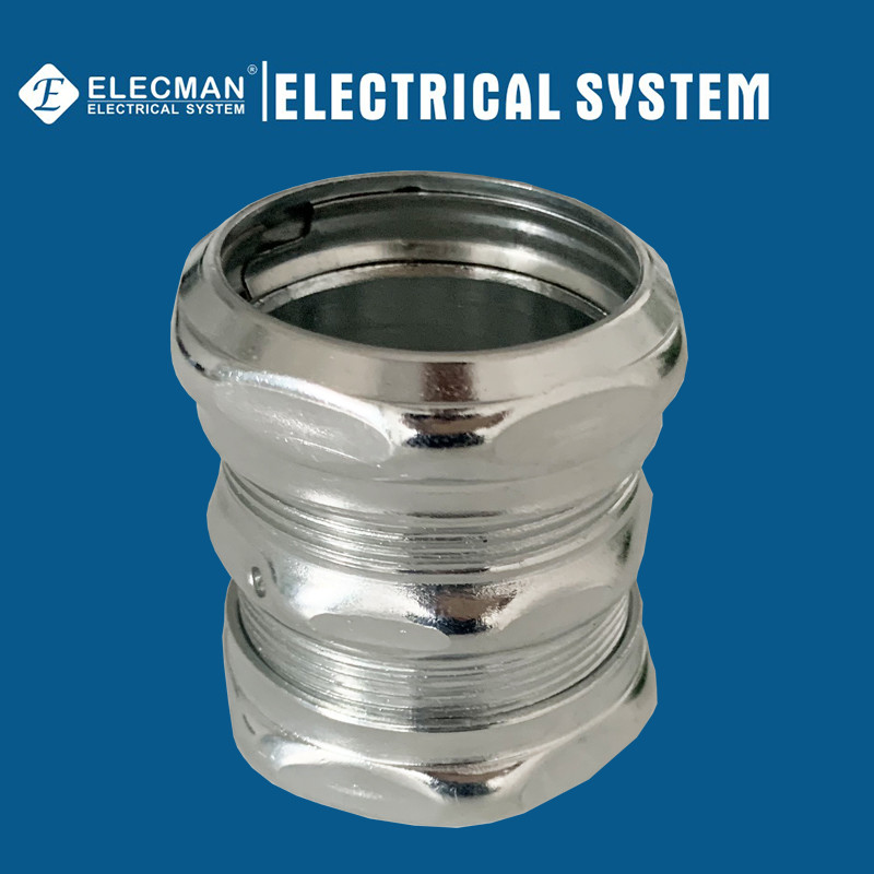 ELECMAN®鋼鉄EMTの圧縮のカップリングは薄い壁EMTの水路の端を一緒に結合するとき圧縮のタイプ アセンブリを取付け、安全で、具体的で堅い、raintightの保護を提供し容易の特色にする。耐久性および長寿のための亜鉛によってめっきされる終わりを用いる鋼鉄構造を持続させるために造られる特色になること;4"への1/2からの利用できるサイズ」。ほとんどのサイズULはリストした。