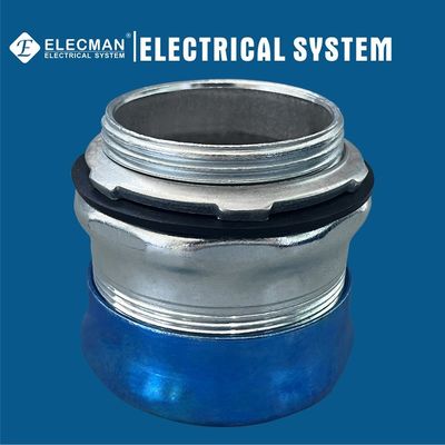 ELECMAN® Raintight鋼鉄EMTの圧縮のコネクターがraintightの環境の箱かエンクロージャにEMTの水路を結合するのに使用されている。 設計は水路、箱またはエンクロージャに水浸透を防ぐ。 箱とコネクター間のraintightの関係のためのコネクターのシールの取付けの雄ネジのガスケット